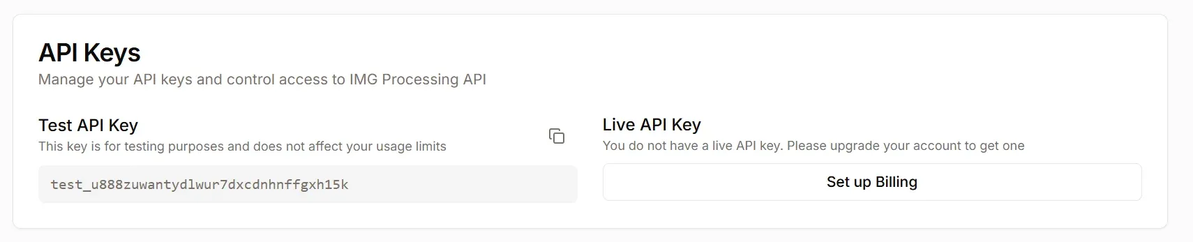 As soon as you sign up for the IMG Processing API, you will receive a test API key that you can use to make requests to the API. This key is for testing purposes only, since it has a limited rate limit, adds a watermark to the processed images, and images won’t be stored for more than 90 days.
