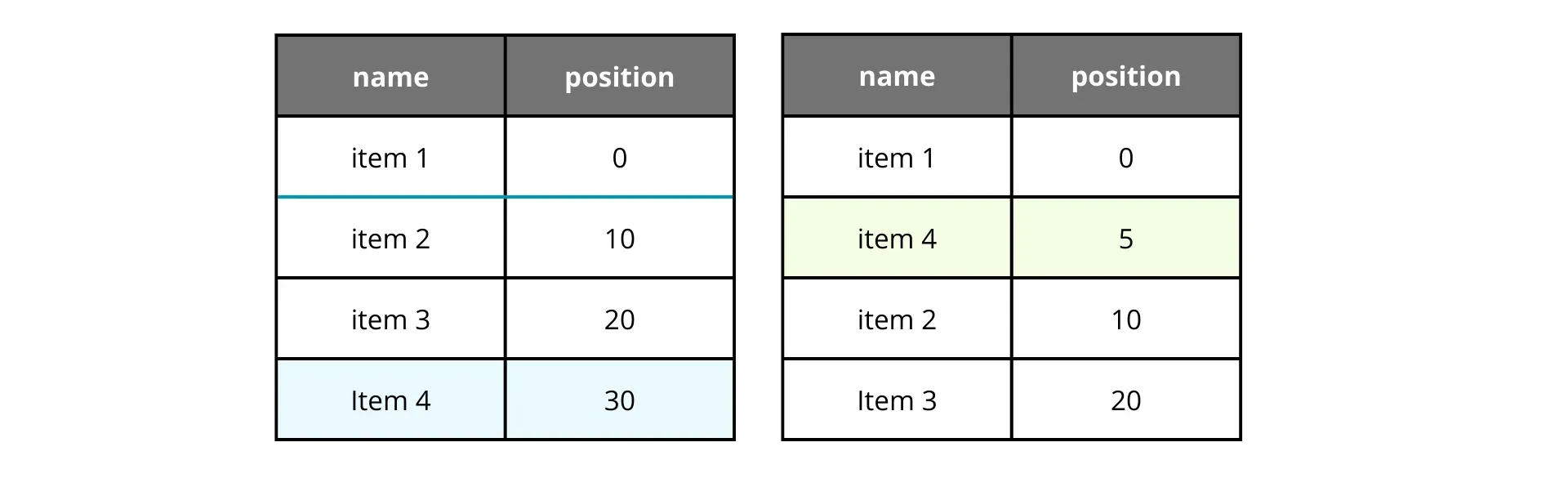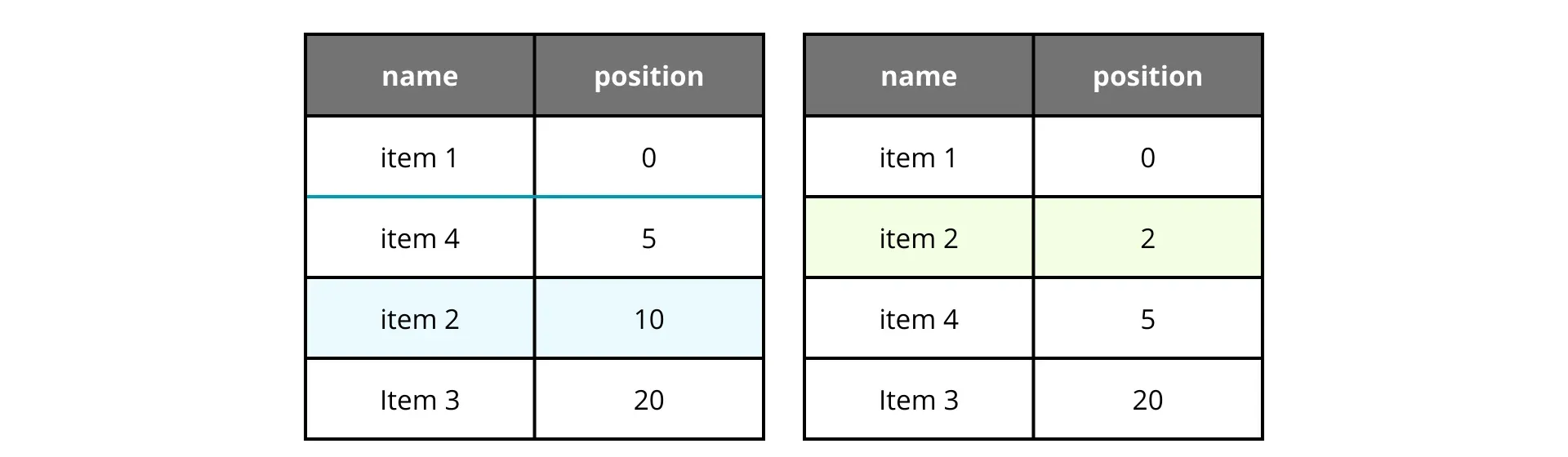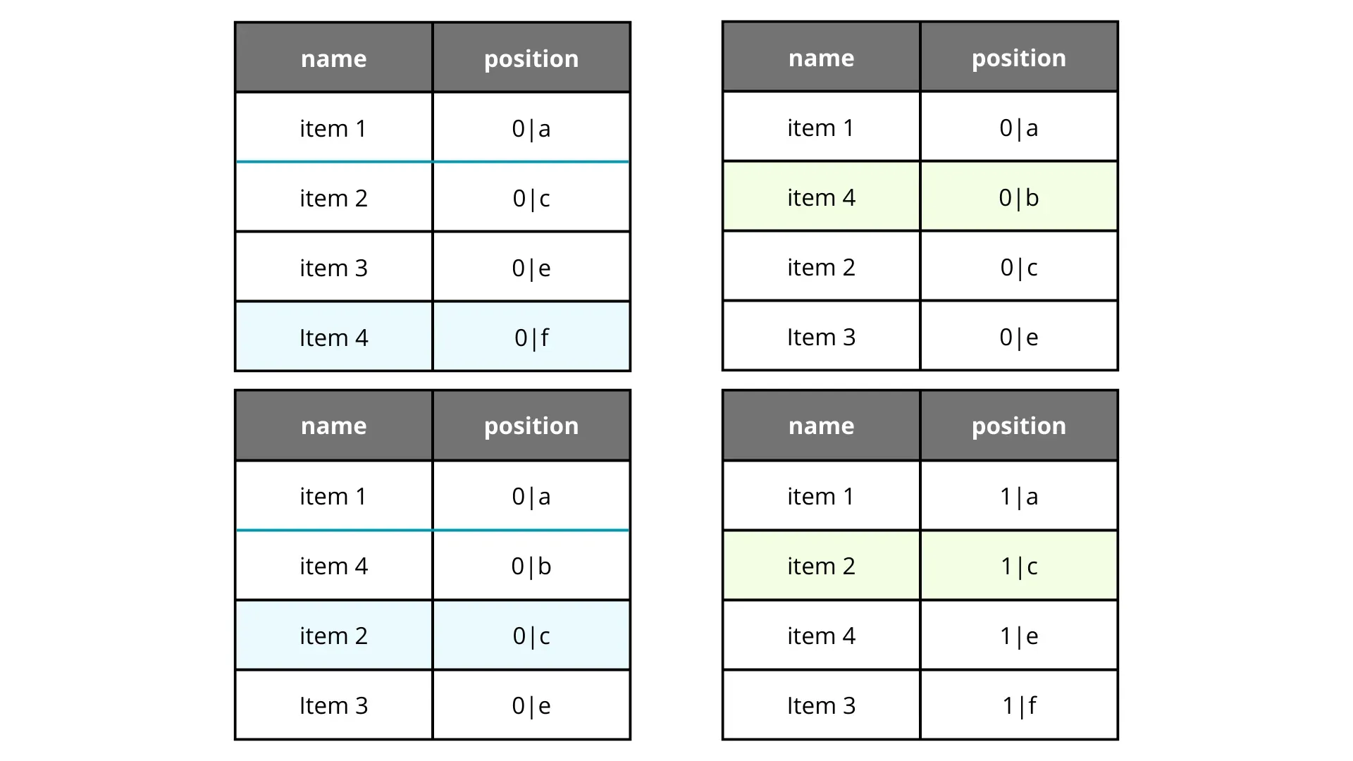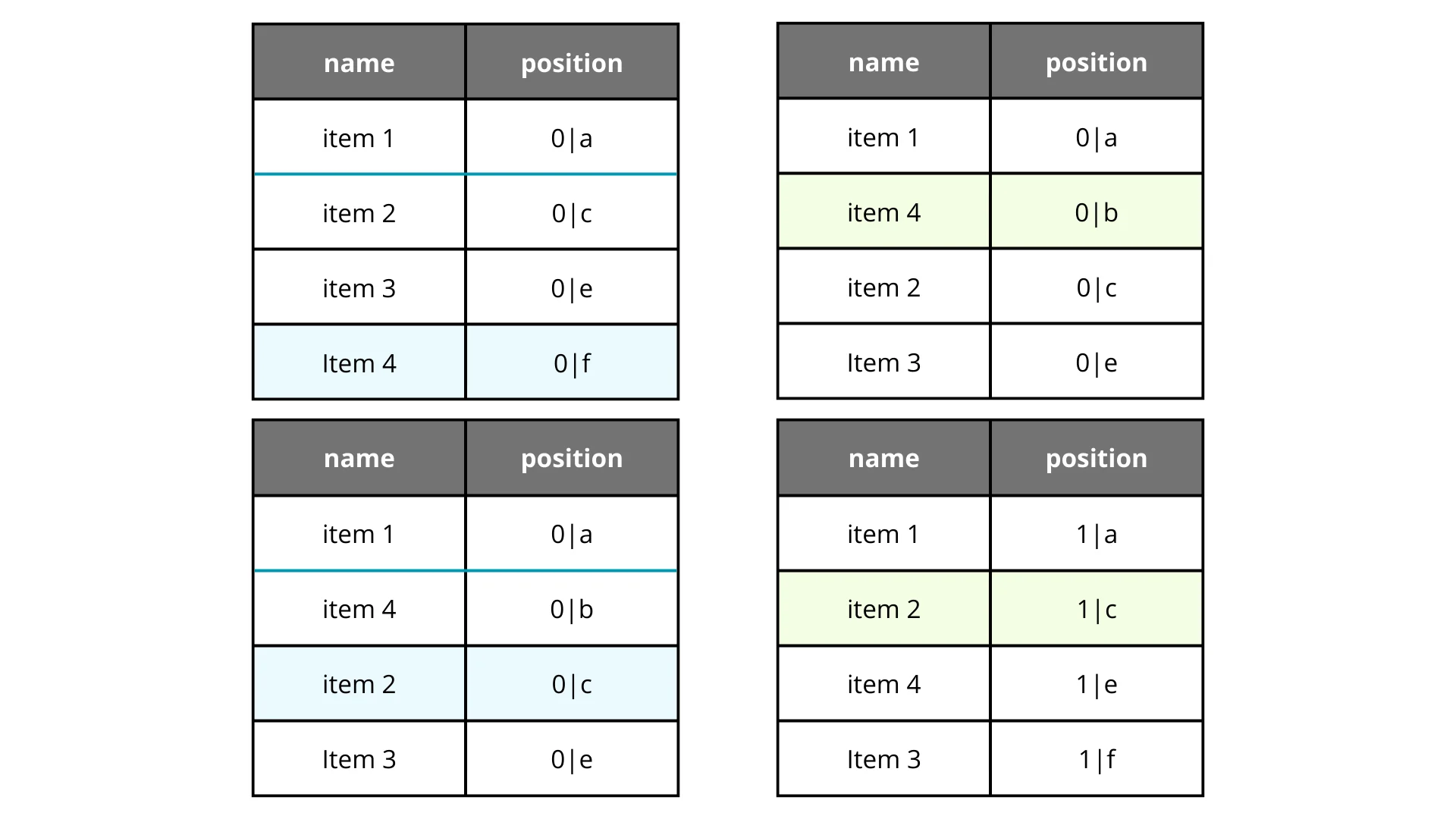 If we want to move an item, we calculate the midpoint between its new neighbors. It works like a charm, until it doesn’t. Let’s say we move item 2 back to the second position repeatedly.